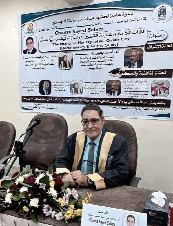 ونجح الباحث أسامة سيد سالم بإجراء دراسة توثيقية وسياحية نال عنها درجة الماجستير من كلية السياحة والفنادق جامعة الأقصر حيث تناولت الدراسة التوثيق الدقيق والرؤية السياحية التنموية للتراث غير المادي بمدينة القصير مؤكداً أن الأبحاث الجادة قادرة على إحياء الذاكرة الجمعية وربط الماضي بالحاضر وصياغة مستقبل أكثر ثراءً.